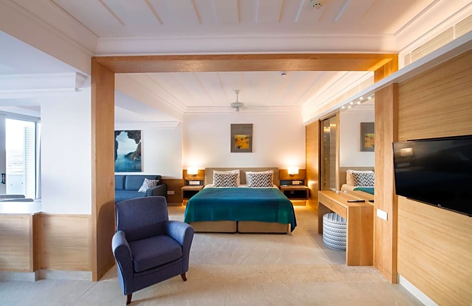 These stylish 154 ft² suites are light and spacious with king, queen or twin beds, a comfortable living area with flat-screen TV, and a luxurious marble bathroom. Sit and relax with a book on the sunny wooden balcony overlooking over the peaceful garden, outdoor pool and the sea beyond. Features a large seating area, writing desk, Nespresso machine and Molton Brown toiletries.